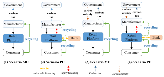 在政府法规与环境压力推动下,服装制造商常通过消费者直接回收或借助零售平台回收。然而,平台开展回收业务时常面临资金约束。针对这一背景,该研究构建了服装闭环供应链模型,探讨不同碳政策(碳减排补贴与碳税)及混合融资(股权融资+银行贷款)下的回收策略。研究表明:一、从供应链经济效益看,碳补贴比碳税更能激励制造商与平台提升回收成效。二、当新产品初始市场需求低且股权融资比例高时,企业倾向于设定较高的零售与批发价。三、股权融资比例越高,制造商会提供更具吸引力的回收激励价格。四、研究给出了政府碳补贴与碳税政策的最优选择,并提出了针对制造商与平台的最有效回收策略。拓展模型还探讨了股权融资失败情况下的最优回收策略。
