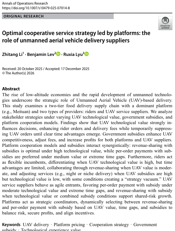引用格式:Li, Z., Lev, B. & Lyu, R. Optimal cooperative service strategy led by platforms: the role of unmanned aerial vehicle delivery suppliers. Ann Oper Res (2026).//doi.org/10.1007/s10479-025-07014-8.
