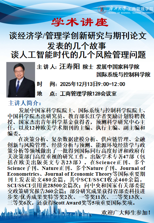 学术讲座|谈经济学/管理学创新研究与期刊论文发表的几个故事、谈人工智能时代的几个风险管理问题