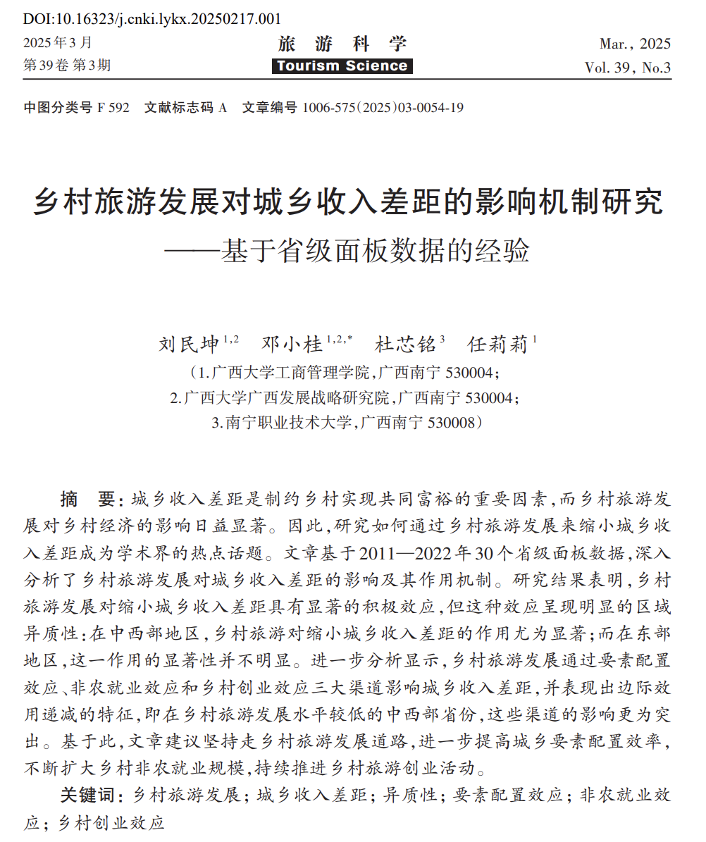 刘民坤教授科研团队在乡村旅游与城乡发展领域取得新进展,研究成果以《乡村旅游发展对城乡收入差距的影响机制研究——基于省级面板数据的经验》为题,在旅游管理领域高水平期刊《旅游科学》2025年第3期发表。刘民坤教授为第一作者,邓小桂、杜芯铭、任莉莉等共同参与研究,91吃瓜