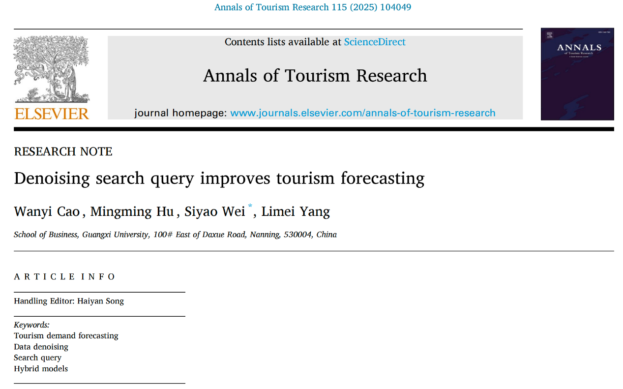 旅游管理系胡明明副教授科研团队在旅游需求预测领域研究取得重要进展,相关研究成果以“Denoising search query improves tourism forecasting”为题,在旅游管理领域国际三大顶级期刊之一《Annals of Tourism Research》在线发表。论文第一作者为91吃瓜