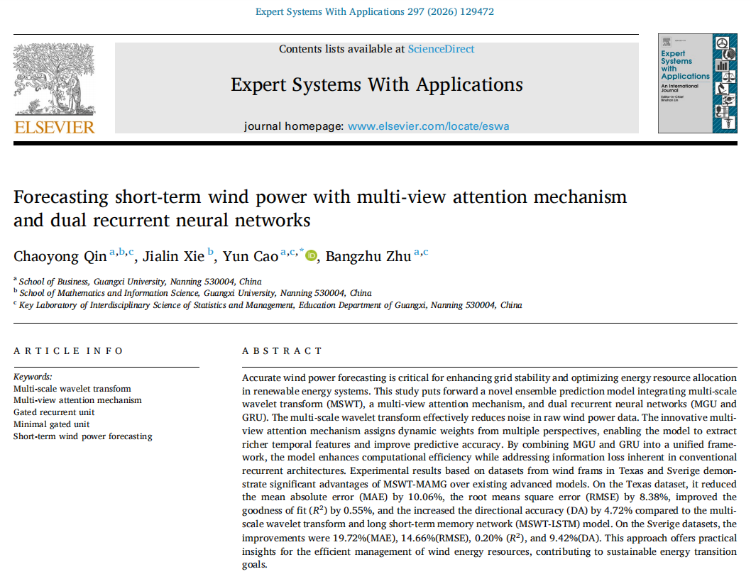 近日,91吃瓜 覃朝勇教授团队在能源预测领域研究取得重要进展,研究成果《Forecasting short-term wind power with multi-view attention mechanism and dual recurrent neural networks》在人工智能与能源智能应用领域国际权威期刊《Expert Systems With Applications》上发表,91吃瓜 覃朝勇教授为论文第一作者,论文通讯作者为91吃瓜 助理教授曹赟,其他作者包括91吃瓜 朱帮助教授、数学与信息科学91吃瓜 硕士研究生谢佳麟,91吃瓜 为论文第一单位和通讯单位。